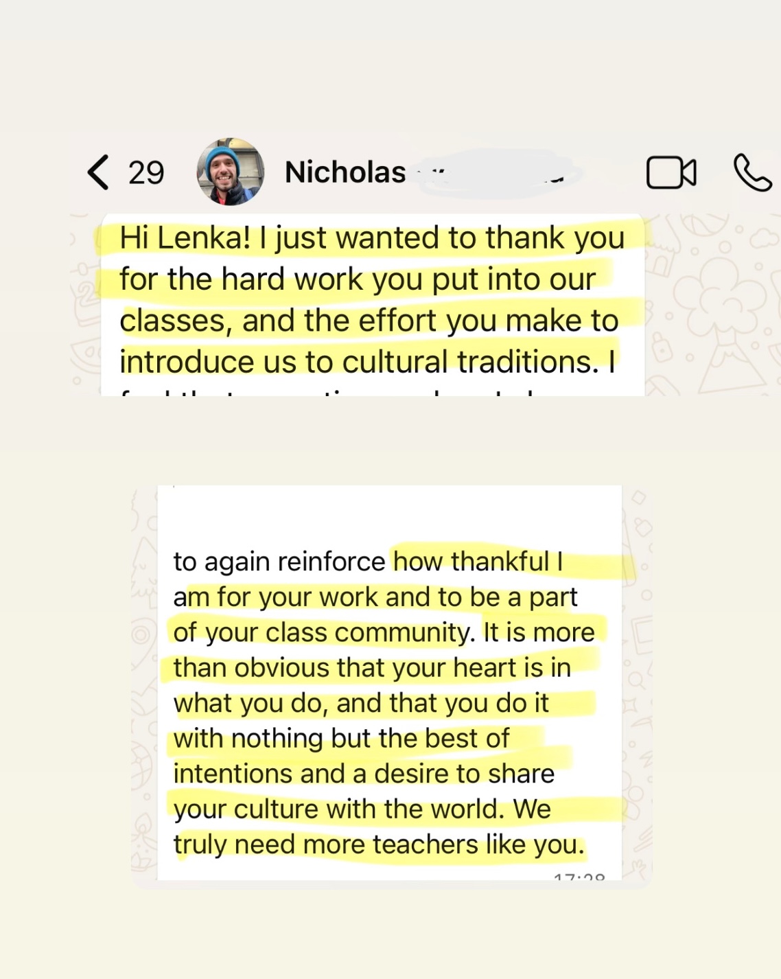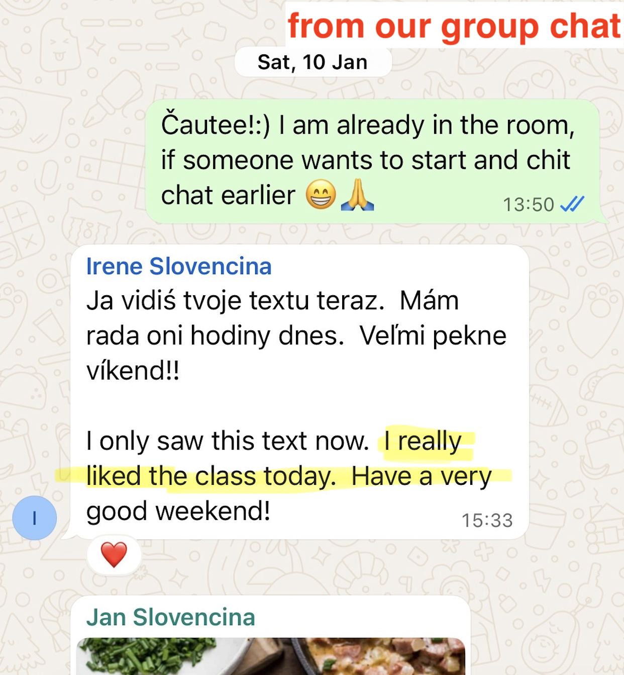 There will be max. 6 people in one class. You will have a different speaking partner each time so you can all get to know each other. I will make sure everyone feels comfortable and has enough space to talk. The atmosphere is always friendly and cozy. We meet every second week. We also have our private Whatsapp group, where we exchange information, pictures or fun facts. 🙂